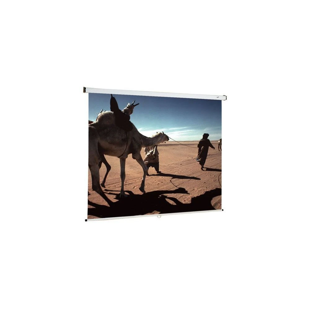 Toile blanc mat, dimensions 200 x 200 cm. Mécanisme d’enroulement parfaitement silencieux avec arrêt automatique par cliquet. Planéité totale de la toile. Carter en profilé d’aluminium laqué blanc résistant à la torsion. Réglage progessif de la hauteur tous les 10 cm. Système de fixation murale ou plafond fournis.
