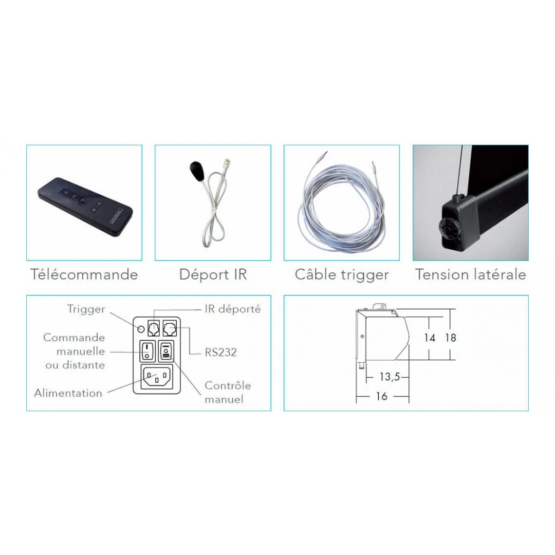 L’écran de projection Coliseum UHD 4K est un modèle tensionné compatible avec les installations domotiques et doté d’une toile conçue pour projeter une image Ultra HD 4K. Lumene Coliseum UHD 4K, un moteur robuste et silencieux Le moteur de l’écran home-cinéma est de nouvelle génération et a été entièrement repensé pour offrir un confort d’utilisation et une grande durée de vie. En effet, la construction du moteur émet un bruit inférieur à 35 dB et il embarque un mécanisme de freins optimisés pour plus de précision lors de la monté et la descente de la toile. Une toile nouvelle génération pour les performances optimisée La toile de l’écran Lumene Coliseum UHD4K est fabriquée en PVC souple. A la différence avec les toiles HD des écrans de la même marque la surface de la toile UHD 4K est quant à elle recouverte de micro perles structurées en diamant permettant une réflexion parfaite de l’image 4K. La couche inférieure blanche a une température de couleur de 6000 Kelvin et la différence entre la lumière réfléchie et celle de la pièce est inférieure à 60 Kelvin. Le résultat sur la toile est un reflet pur, extrêmement détaillé, fidèle à l’image originale projetée. Les rebords noirs qui entourent la toile blanche améliorent le niveau de contraste perçu ! La directivité de 160° offre aux spectateurs décentrés les mêmes paramètres de visionnage que les spectateurs assis au centre. Le dos noir occultant permet de placer l’écran Lumene Coliseum UHD-4K devant une source lumineuse comme une fenêtre par exemple. Lumene Coliseum UHD 4K : Avec système de tension latérale de la toile L’écran de projection électrique Lumene Coliseum UHD 4K adopte un système de réglage fin de la tension latérale, ce qui assure une parfaite tension et planéité de la toile, pour qu’aucune déformation de l’image ne vienne troubler le visionnage des films. Un système de fixation simple faciliter l’installation de l’écran Lumene Coliseum UHD 4K L’écran de projection Lumene Coliseum UHD-4K est facile d’installation grâce à son système de fixation par clips qui permet un montage au mur comme au plafond. Il est également possible de le suspendre au plafond avec les crochets livrés. Son carter en aluminium laqué noir permet une intégration parfaite dans une salle de cinéma privé ou dans un salon. Télécommande IR, domotique RS232, trigger 12V Pour piloter la montée ou la décente de l’écran Coliseum UHD-4K, la télécommande infrarouge assure le pilotage fin et précis. Est livrée également une commande manuelle si nécessaire. De plus, aidé de sa connectique de contrôle domotique RS232, les spécialistes apprécieront l’écran de projection Lumene. Pour finir avec la connectique, cet écran de cinéma intègre également une entrée trigger 12 volt qui permet le déploiement automatique de la toile à la mise sous tension du vidéoprojecteur (câble 10 mètres fourni).