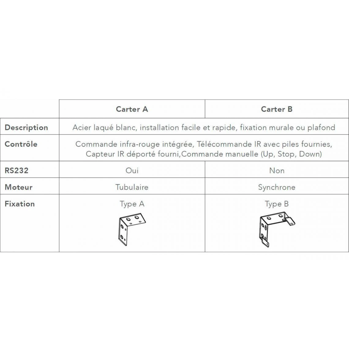 L’écran de projection home-cinéma Embassy HD 200V de la marque Lumene est un modèle 4/3 motorisé et robuste affichant de belles prestations pour un prix très raisonnable. Lumene Embassy HD, une épaisse toile pour optimiser la durabilité Par rapport à l’ancien modèle, l’Embassy II, la toile de l’Embassy HD a été amélioré. Le tissu blanc mat est composé de quatre couches. La première étant une surface de réflexion recouverte de micro points en PVC permettant de refléter une image très précise. Puis, intercalée entre deux autres couches en PVC, se trouve une structure en fibre de verre apportant de la solidité. L’épaisseur totale de la toile est portée à 0.64 mm. Cette nouvelle version de toile est plus résistante et de meilleure qualité que la version précédente. De plus, la toile de l’écran de projection Lumene Embassy à subit plusieurs traitements lui permettant de résister aux différents niveaux de températures et d’humidités. Elle résiste également aux étirements et possède des propriétés antioxydantes. Cela permet d’offrir notamment une colorimétrie juste sans point de brillance ! Lumene Embassy HD, des finitions haut de gamme pour une meilleur intégration ! Les rebords noirs qui entourent la toile blanche améliorent le niveau de contraste perçu ! La directivité de 160° et le gain de 1.0 offrent aux spectateurs décentrés les mêmes paramètres de visionnage que les spectateurs assis au centre. Le dos noir occultant permet de placer l’écran devant une source lumineuse comme une fenêtre par exemple. La finition du carter en acier laqué blanc légèrement pailleté est séduisante et son système d’accroche facile et rapide permet une fixation au mur comme au plafond. Pour contrôler l’écran, est livré une commande infra-rouge, une télécommande IR avec piles (fournies), un capteur IR déporté fourni et une commande manuelle.