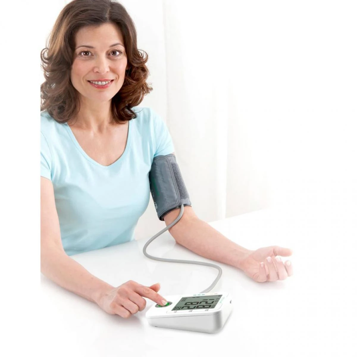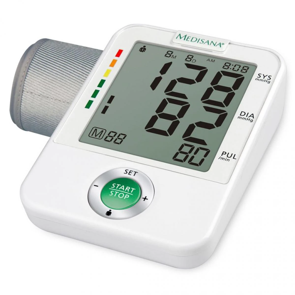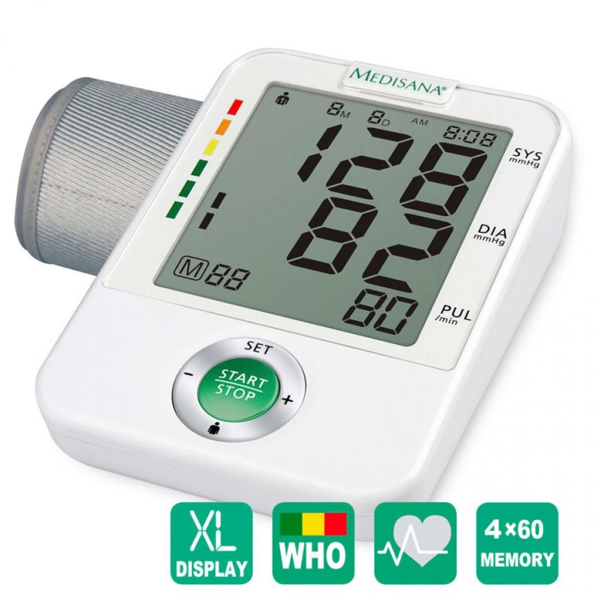 Avec le tensiomètre de bras BU A50 de Medisana, vous pouvez facilement surveiller votre tension artérielle à la maison. Les valeurs suivantes sont mesurées et affichées : pression systolique, pression diastolique, pouls, date et heure. Ce tensiomètre a été conçu avec un brassard très large (pour les tours de bras entre 22 et 36 cm) et un affichage extra-large et facile à lire. Le BU A50 peut également détecter l’arythmie cardiaque et possède 60 emplacements de mémoire pour 2 utilisateurs chacun. La valeur moyenne des trois dernières mesures est calculée. Les mesures sont classifiées d’après le système d’évaluation de l’OMS (Organisation Mondiale de la Santé) en utilisant un code couleur rouge-jaune-vert. Le tensiomètre fonctionne grâce à 4 piles AA incluses dans la livraison.