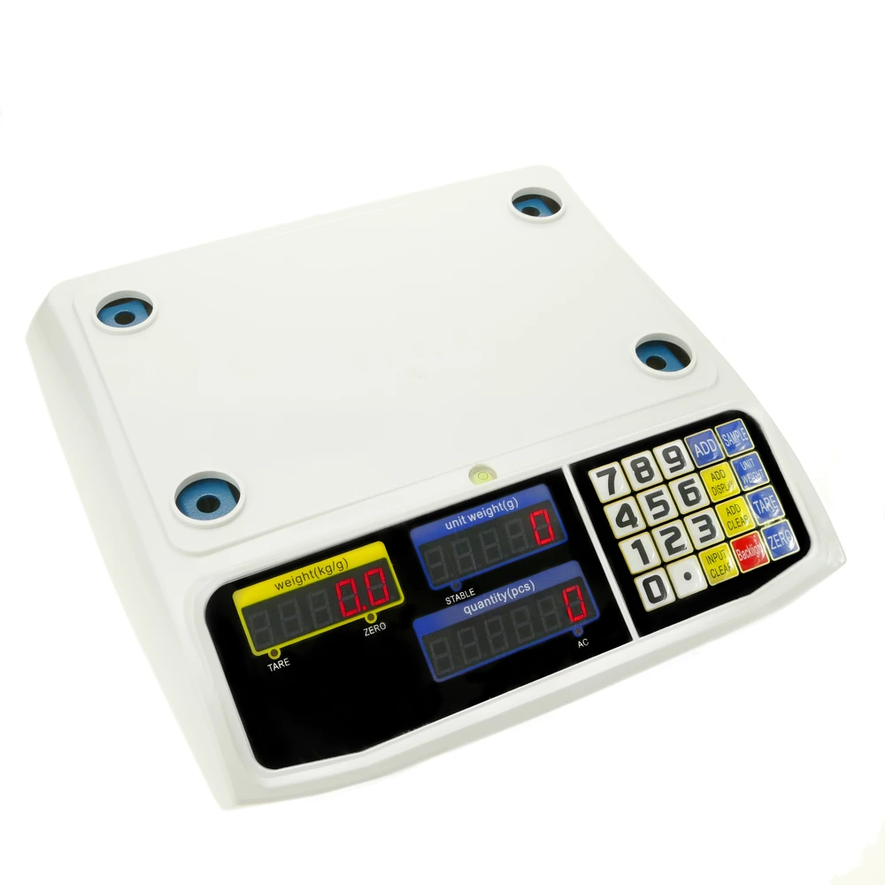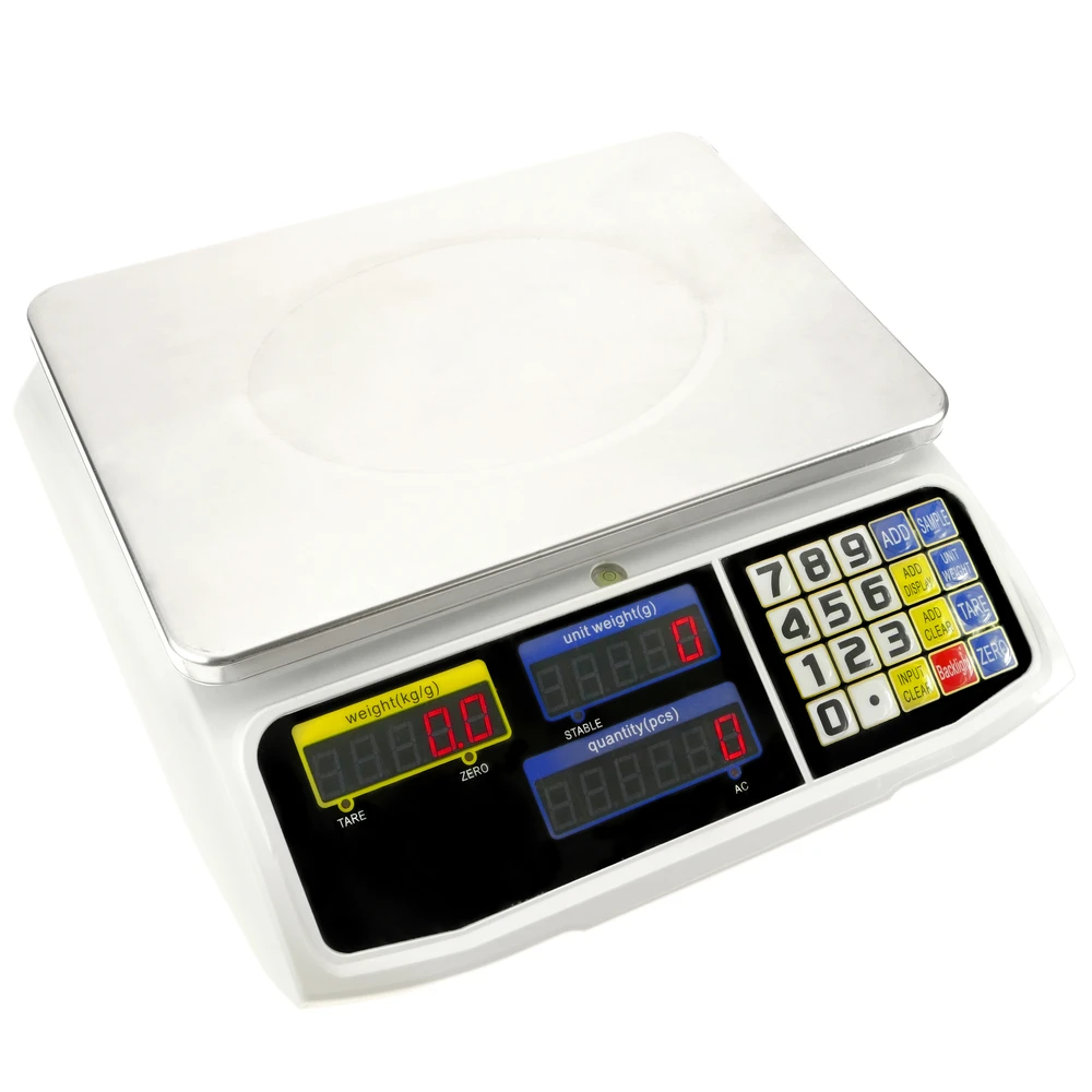 - Conçu pour les comptoirs à vendre dans les magasins, entrepôts, utilisations industrielles, etc. Balance avec électronique numérique de haute fiabilité et avec 3 écrans LCD (poids, unités de poids et quantité).