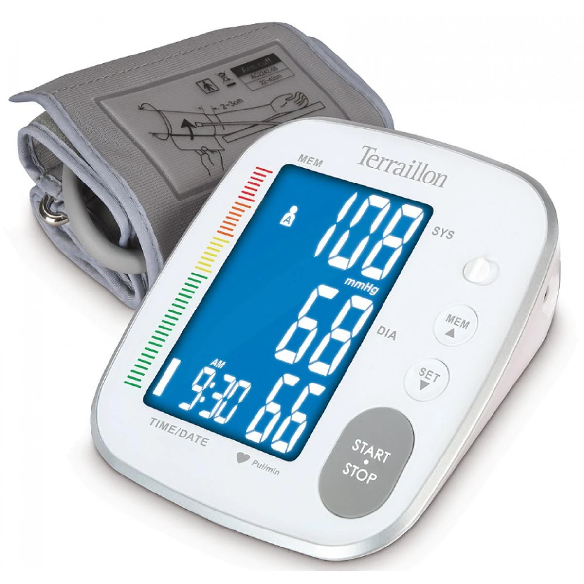 tensiomètre automatique au bras supérieur – hba62130wh – Tensiomètre Terraillon HBA62130WH complet et précis.TOUTE LA FIABILITÉ DE L?AUTOMESURE À DOMICILE : Suivez simplement votre tension artérielle au quotidien! Ce tensiomètre bras vous aide à analyser, comme chez votre professionnel de santé, votre rythme cardiaque et votre tension. Simple d’utilisation, il est doté de 2 profils utilisateurs. Pour chaque profil il fait la moyenne des 3 derniers relevés et garde en mémoire jusqu’à 250 relevés.GARDEZ LE CONTROLE EN TOUTE SIMPLICITE : Suivez l’évolution de votre tension à domicile. D’une simple pression, lancez l’analyse et découvrez sur le grand écran LCD les résultats de votre prise de tension. L’échelle de couleur sur le produit donne une interprétation de vos résultats selon les normes officielles de l’OMS. – Type : Tensiomètre.
